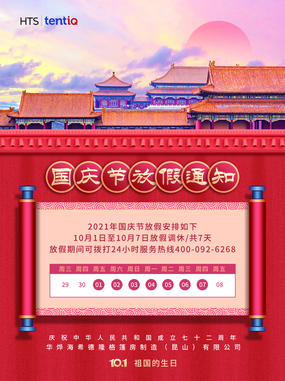 感謝大家一直以來對華燁篷房的大力支持與厚愛,國慶節(jié)將至,結(jié)合公司實際情況,現(xiàn)將2021年國慶節(jié)安排通知如下:10月1日至7日放假調(diào)休共7天,10月8日至9日(周五、周六)上班。在此期間想了解篷房相關(guān)知識和報價方案的可以直接撥打華燁海希德隆格篷房制造(昆山)有限公司24小時服務(wù)熱線400-092-6268。