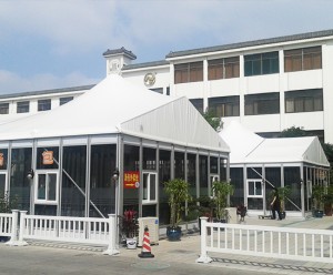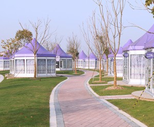 華燁篷房在設(shè)計整個營區(qū)的篷房時,在保證安全的前提下,以美觀實實用為第一要素,最終決定采用多邊形尖頂篷房,神秘的紫色頂篷,四周全玻璃設(shè)計,密封性能更好,實現(xiàn)空調(diào)恒溫,保證舒適度。