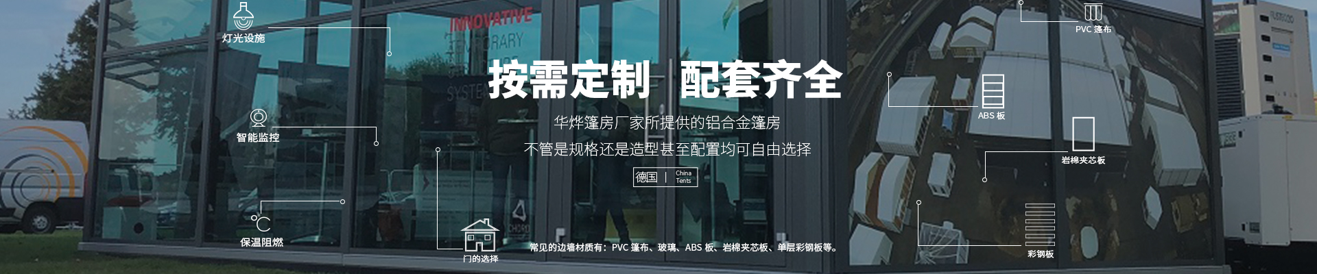 篷房主體分為框架、頂篷以及四周邊墻,邊墻事獨(dú)立的,你可以選擇它的材質(zhì),也可以選擇要不要安裝邊墻,它主要起到圍擋的作用,不同用途下需要 選擇不同的邊墻材質(zhì),常見的邊墻材質(zhì)有:PVC篷布、玻璃、ABS板、巖棉夾芯板、單層彩鋼板等。